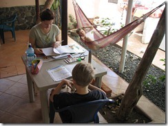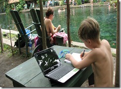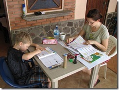 Kiedy zatrzymujemy się w jednym miejscu na dłużej zaczynamy naukę o 9.00 i pracujemy do około 12.30. Wczoraj poznałam 10 letniego chłopca z USA, którego uczy jego tata. Oni także zaczynają i kończą lekcje w tych samych godzinach co my. Wojtuś i Ania mają zajęcia w tym samym czasie. Staram się tak dopasować program, abym mogła z każdym pracować indywidualnie. Kiedy Ania czyta lub pisze jestem z Wojtkiem, kiedy Wojtuś rozwiązuje zadania jestem z Anią. Nie macie pojęcia ile dowiaduję się o swoich dzieciach!