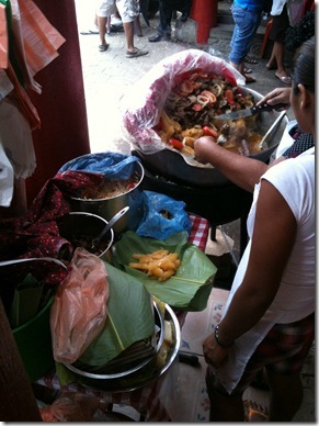 | Description: | Served in banana leaves it includes beef, yucca, plantain plus salad. The stew in which the meat is prepared is made up of various vegetables and fruits (see picture above). It takes two days to prepare including meat marination and steaming. Though it is served as comida rapida (fast food) it is very healthy, cheap and savory. |