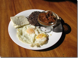 | Description: | Traditional dish usually served for breakfast. It is made up of pre-cooked rice and red beans (frijoles) and is sometimes accompanied by fried egg, cheese etc. After mixing rice and beans the dish, as the name suggests, has the appearance of a “painted rooster”. Another origin of its name is derived from pretending the dish contains meat, which its basic form does not have. |