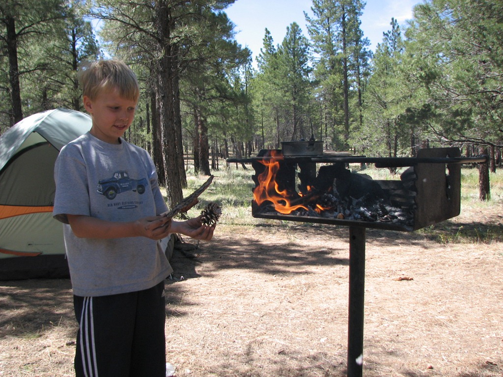 Marzenie o ciepłej herbacie chodziło nam nieustannie po głowie. Zakupiliśmy więc podręczny zestaw do gotowania składający się z dwóch garnków pół litrowych, trochę jedzenia, a w tym „polską kiełbasę” – taka nazwa produktu widniała na opakowaniu i rozpoczęliśmy obozowanie pełną gębą. Wojtuś był w raju. Dzień zaczynał od znoszenia drewna na ognisko i rożno, które rozpalaliśmy by „utostować” bułeczki (znane tutaj „bagels” z dziurką w środku i „muffins”). Jednym słowem poczuliśmy się jak w domu.
