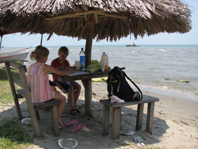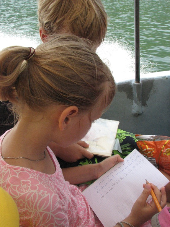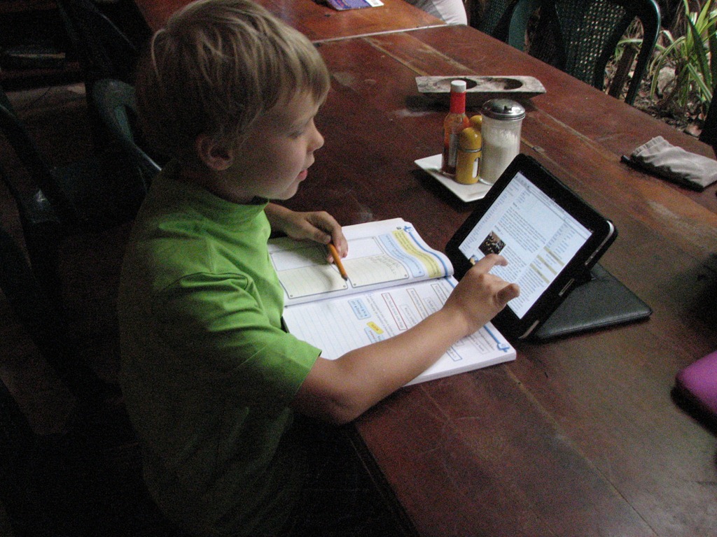 Bez wątpienia możemy podróżować z dziećmi po świecie. Podręczniki, z których korzystamy są bardzo dobrze opracowane i łagodnie prowadzą nas przez program szkolny. Mamy pełną swobodę w aranżacji czasu i formy zajęć. Choć staramy się pracować regularnie w ciągu tygodnia to nie zawsze jest to możliwe. Czasami robimy lekcję płynąc łódką, jadąc autobusem lub czekając na lunch, bo właśnie w restauracji znajdujemy wygodne krzesła i porządny stół. Przebywamy z naszymi dziećmi więcej niż kiedykolwiek w życiu.