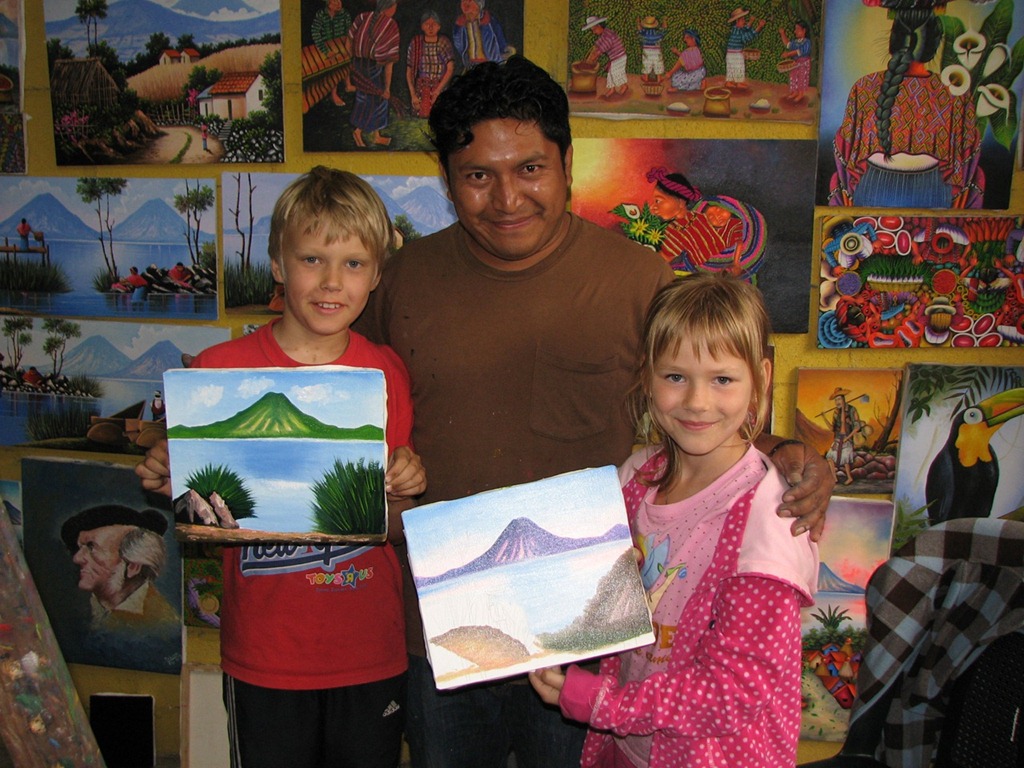 Odpowiadając za edukację naszych dzieci możemy więc inspirować je do rozwijania nowych umiejętności. Ania i Wojtuś z wielkim zapałem uczyły się malarstwa pod okiem Gaspara – gwatemalskiego malarza w San Pedro de Laguna. Wyniki ich twórczości zobaczycie poniżej.