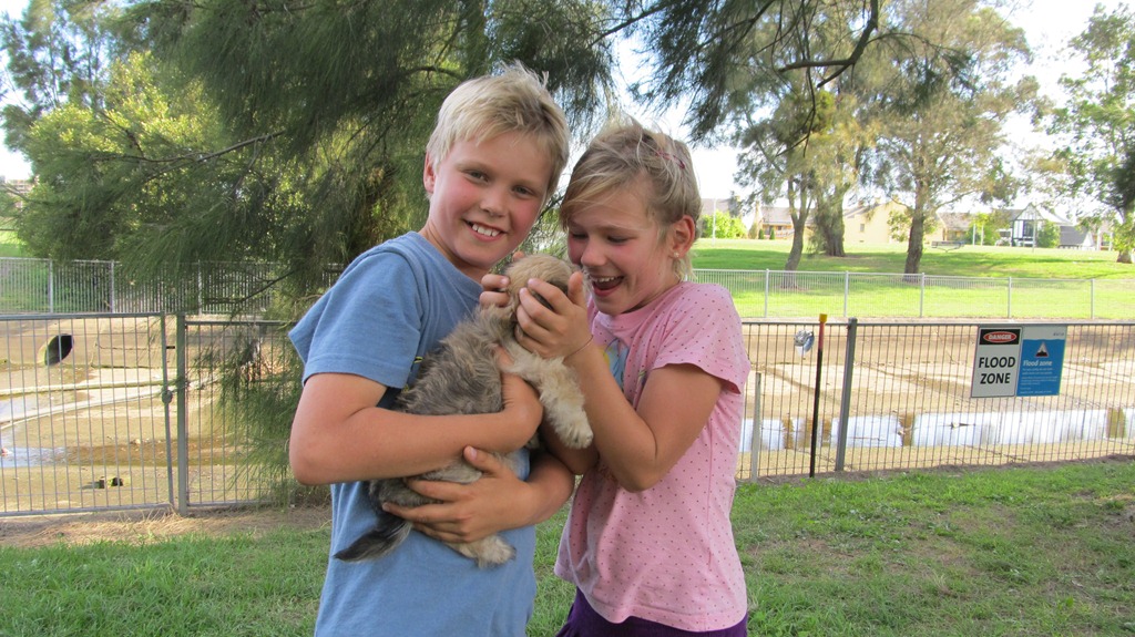 Docierając na nasz kolejny camping w Sydney w upalny dzień byliśmy zdegustowani brudem jaki panuje tu w kuchni i na tzw. świetlicy. Przygnebiający widokiem jest też to, że większość jego mieszkańców, to długookresowi rezydenci, którzy z różnych powodów utracili swoje domy i zmuszeni są tak mieszkać w oczekiwaniu na lepsze jutro. Jak to jednak często bywa, wśród takiej mizerii spotyka się niezwykłych ludzi. Nasi sąsiedzi na campingu, Tom i Debbie, mieszkają tu już 17 miesięcy!! Mają do dyspozycji rozpadającą się przyczepę campingową połączoną z dużym namiotem. Mają też parkę psów, którym 7 tygodni temu urodziło się 7 małych szczeniąt. Choć widać, że życie ich nie oszczędzało oboje mają tyle ciepła i radości w sobie. Nasze dzieci, a szczególnie Aniusia, są w siódmym niebie bawiąc się z pieskami. Coś się dużo tu tych siódemek porobiło