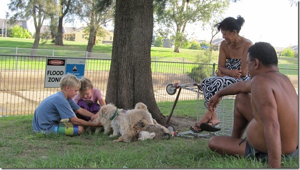 Arriving at our next campground in Sydney on a hot day we were disgusted with how filthy the kitchen and communal area was. An equally depressing picture was the fact that vast majority of its inhabitants are long-timers here. Many of them have been forced to live here having lost their houses, families etc. As is often the case, you can see some bright spots in such places. Our neighbors, Tom and Debbi, have been living in the campground for quite some time now ! They have an old campervan and a tent attached to it. They also have a couple of dogs who 7 weeks ago had 7 beautiful puppies. Despite that they have a lot of warmth and joy of life. Our kids, little Ania in particular, are ecstatic playing with the dogs. It is Ania’s birthday tomorrow and Debbie offered one of the puppies they intend to sell, for Ania as her birthday present. That is amazing! Since we still have thousands of kilometers to cover unfortunately we cannot take any more passangers along. It has been ours kids wish for months now to go, after going back home getting straight from the airport to an animal shelter to adopt a dog or two.