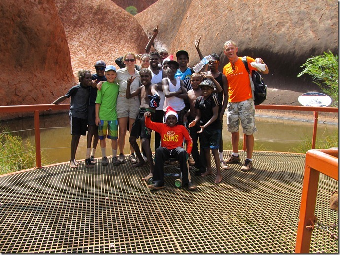 Somewhere half way on our walk around this magic mountain we suddenly heard some noisy bunch of people getting closer to us. It turned out to be a sizeable group of Aboriginal boys of different ages running in the street and playing a ball and doing some acrobatic stunts. When I asked them where they were headed they said they were going to swim in a waterhole. After a small conversation they all continued their lively march in the scorching heat doing a few stunts for us. We were all fascinated by this encounter.