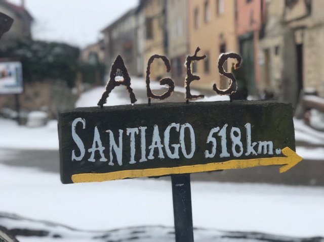 Trasa dzisiejsza zaczęła się od ostrego podejścia i sporej zamieci, która rosła z każdą minutą. Po dojściu na maksymalną dzisiejszą wysokość 1170 m n.p.m. odczuwalna temperatura spadła do jakiś -15 C. Największym wyzwaniem w trakcie wędrówki był lód, który czaił się pod śniegiem. Było to zdecydowanie, jak to nazywa Henry, two-pole day, czyli dzień na dwa kijki. Zwykle idąc używam tylko jednego kijka naprzemiennie dla podparcia i stabilizacji. Dziś kilka razy prawie nie zaliczyłem twardego lądowania. Jak dobrze, że je kupiłem w Estella!