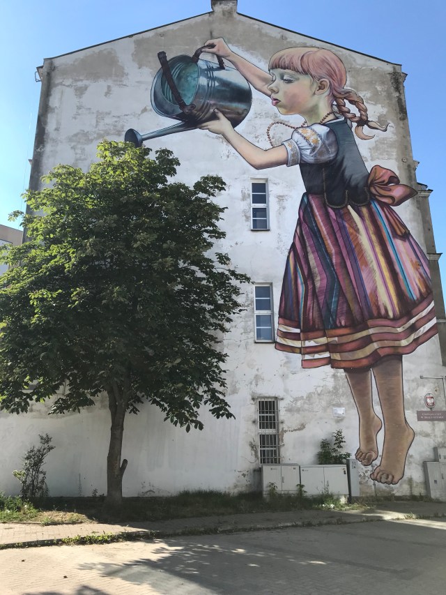 Z Sokółki pojechaliśmy na obiad i spacer do Białegostoku. Miasto ma charakterystyczny trójkątny rynek. Inna atrakcją jest Pałac Branickich. Mi jeszcze wpadł w oko ciekawy mural z dziewczynką podlewającą żywe drzewo.