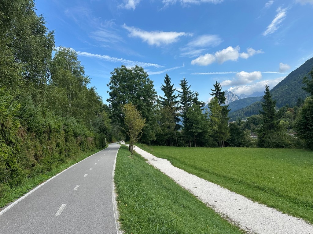 Po około 20 kilometrach wjechałem na bardzo popularny odcinek trasy rowerowej Alpe Adria, której całą trasę do Salzburga przejechałem w zeszłym roku. W słuchawkach akurat pojawił się Zbigniew Wodecki z moim ulubionym utworem „Lubię wracać tam, gdzie byłem już”. Przypadek? W przeciwieństwie do większości rowerzystów ja jechałem na północ i głównie pod górę. Pojawiło się od razu więcej rowerzystów w tym rodziny z kilkunastolatkami. Nie wiem czy jechali długi odcinek czy też całą trasę z Salzburga do Grado ale wyglądało to imponująco.