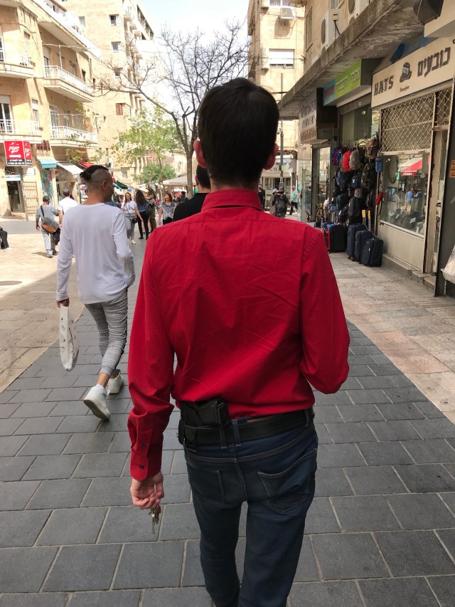 Wspomniałem w powyższej historii o swojej obawie, że mój rozmówca użyje broni. Nie była ona bezpodstawna. Dość szokujące jest spotykanie w biały dzień w Izraelu ludzi, którzy chodzą po ulicach z bronią. Miał ją np. nasz hotelowy recepcjonista, który prowadził nas do hotelu (patrz zdjęcie poniżej).